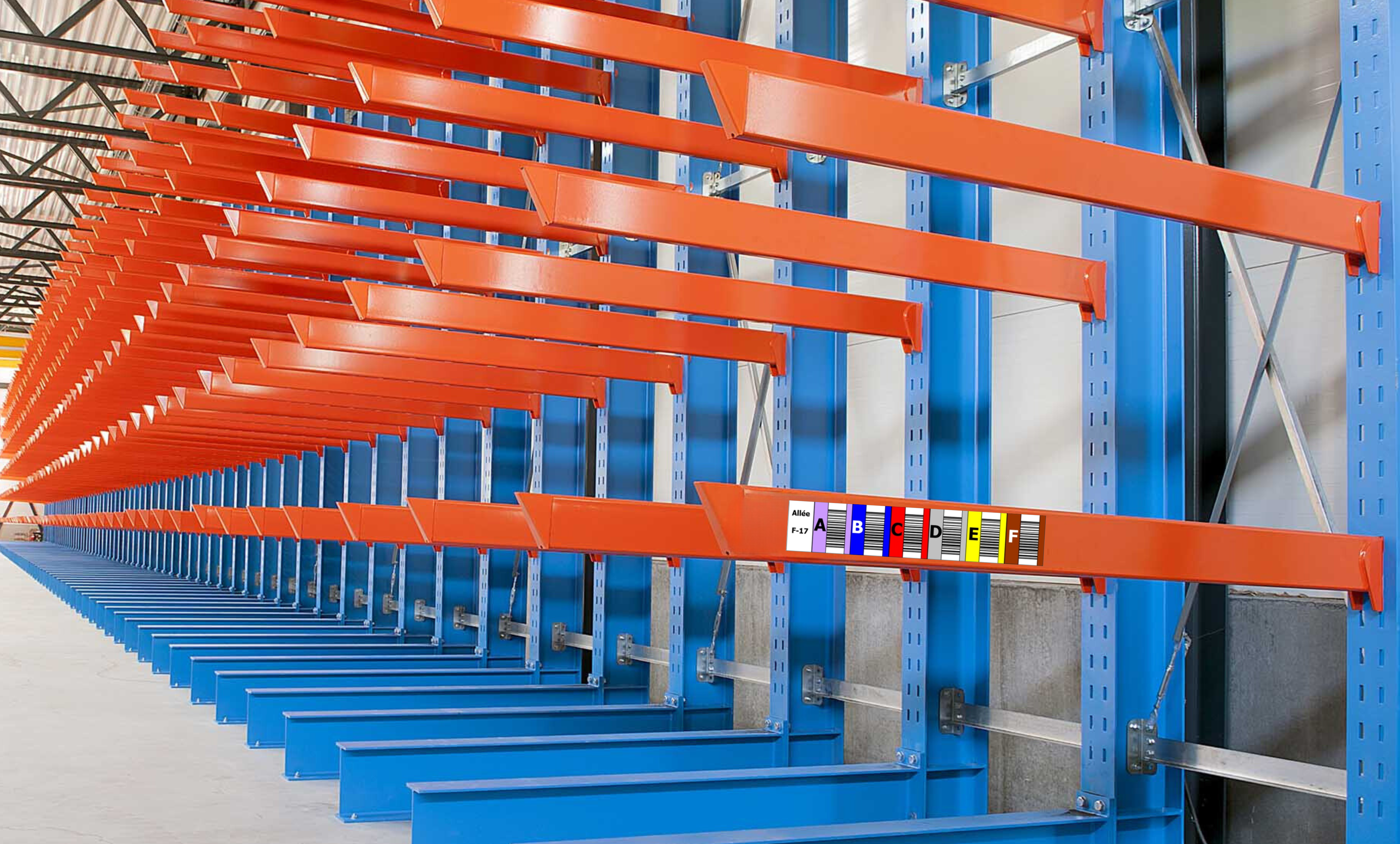 A noter que la version horizontale « inoCode » est idéale pour identifier les niveaux de stockage les plus hauts des cantilevers. Elle peut être collée directement au sol ou sur une barre de sol ou bien sur une plaque vissée au sol. Il est aussi possible d’attribuer à chaque bras une étiquette couleur dédiée à chaque niveau. Pour une gestion simplifiée, l'ensemble des niveaux peut être regroupé sur le bras à hauteur d'homme grâce à des codes multi-niveaux.