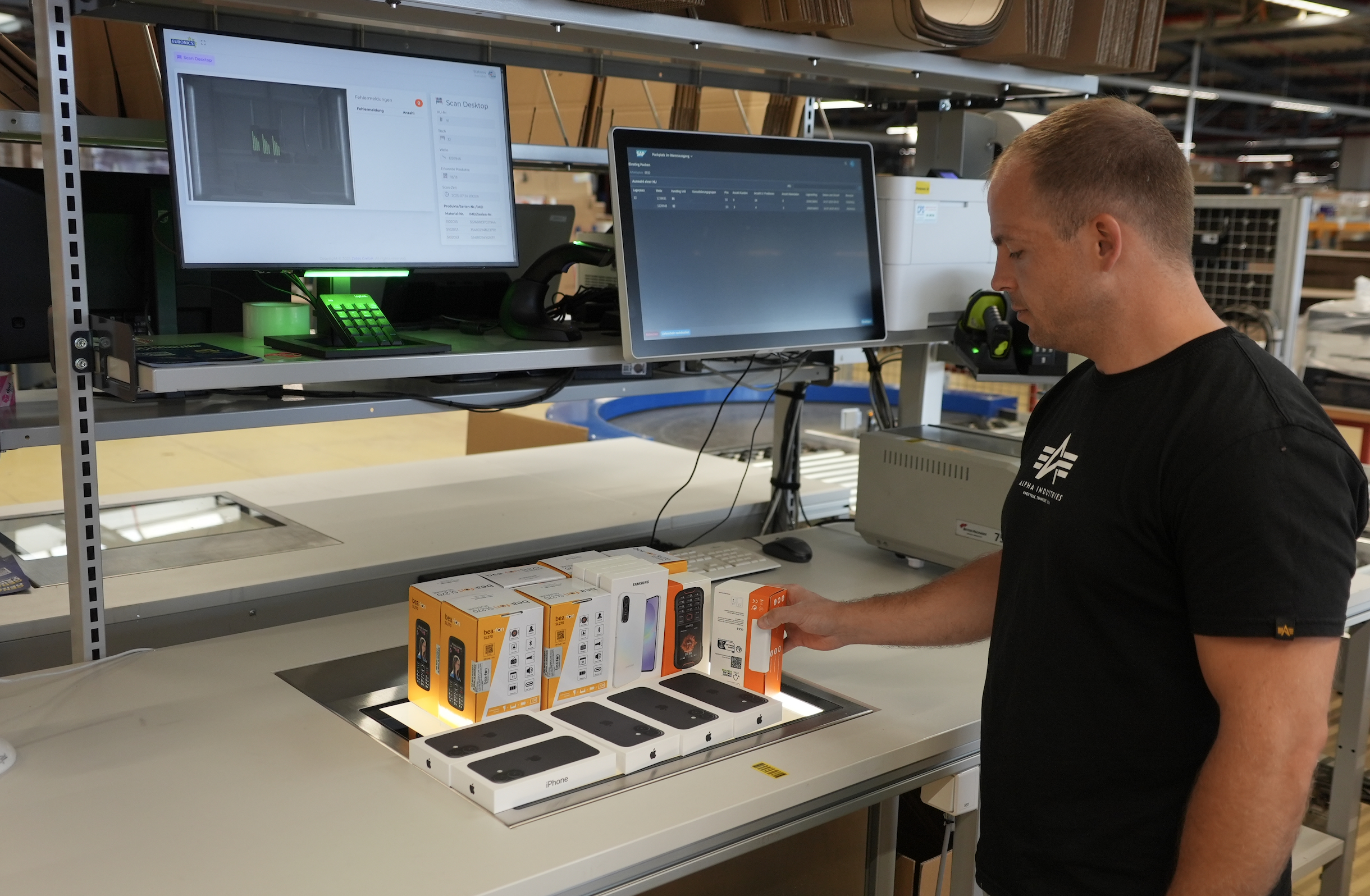 Une fois les articles prélevés, ils sont acheminés vers l’une des quatorze stations d’emballage, où chaque produit est scanné afin d’être synchronisé avec les données de la commande, avant d’être emballé et étiqueté en vue de son expédition. Le scan des smartphones est particulièrement exigeant, car il faut saisir à la fois le nom du modèle ainsi que les numéros de série et IMEI sur des étiquettes de très petite taille, ne dépassant parfois pas 25 mm de haut. Le processus est encore plus complexe pour les smartphones à double carte SIM, qui possèdent deux numéros IMEI, même si un seul des deux doit être scanné.